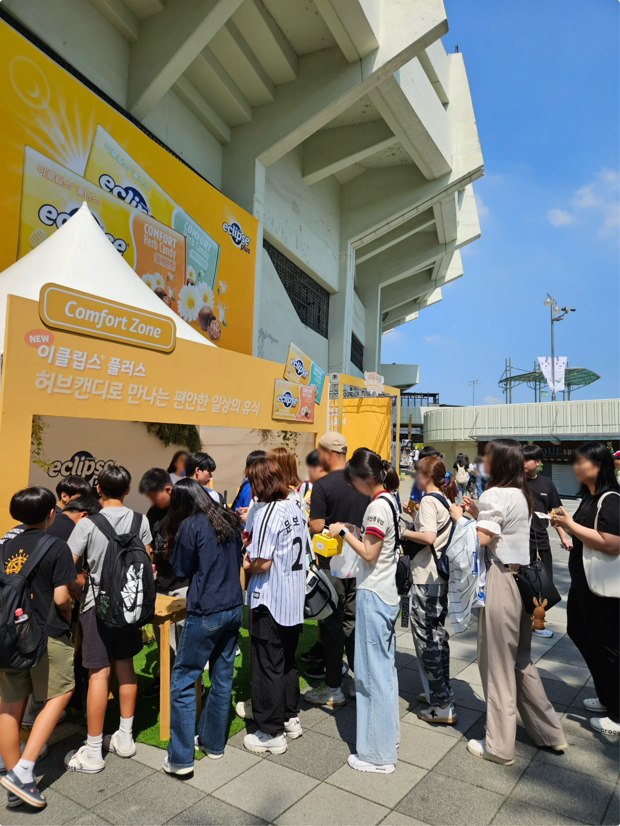 목을 편안하게 해주는 신제품 이클립스 플러스의 제품 소구점과 맞는 야구장에서 샘플링 이벤트 진행